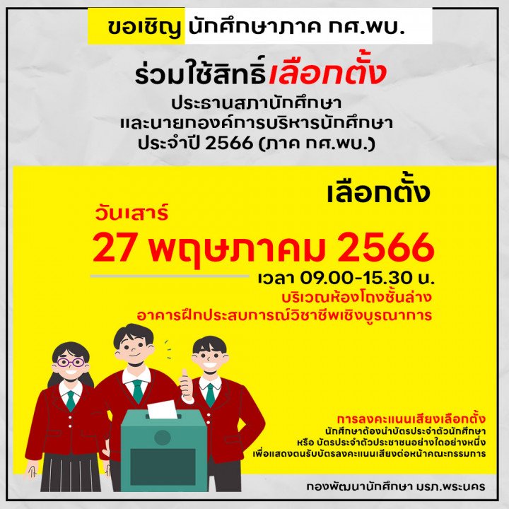 ขอเช ญ น กศ กษาท กช นป ร วมลงคะแนนเล อกต งนายกองค การน กศ กษาภาคปกต ประจำป การศ กษา 2566